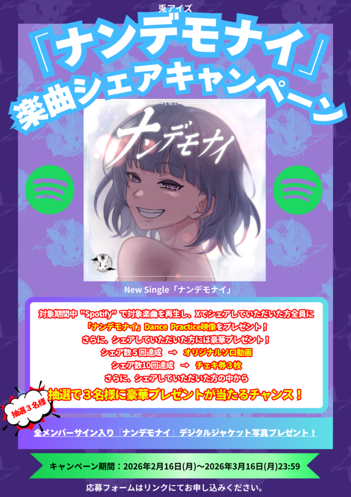 対象期間中、Spotifyで対象楽曲を再生し、Xでシェアしていただいた方全員に「ナンデモナイ」Dance Practice映像をプレゼント!